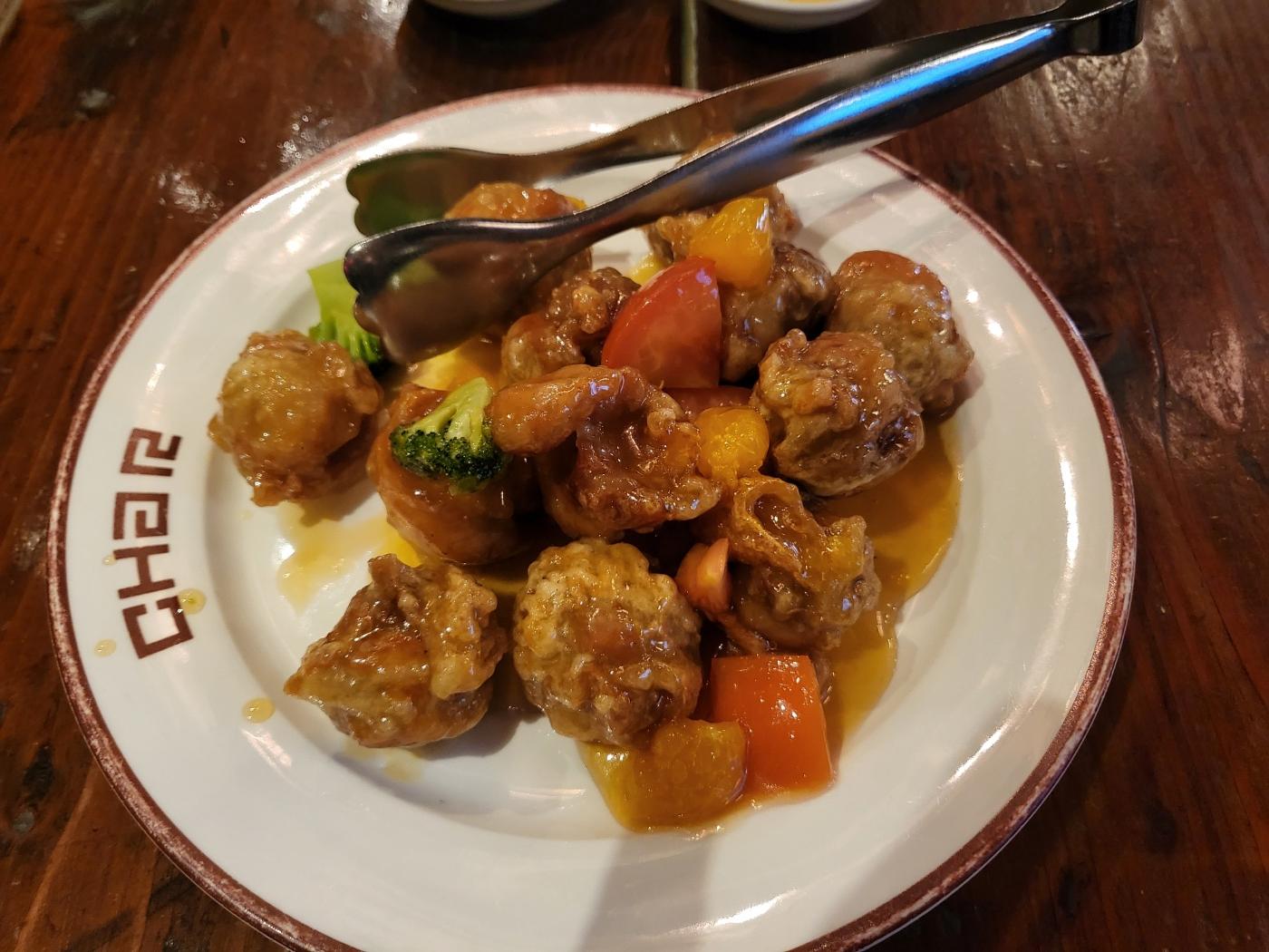 바삭한 튀김과 가지 그리고 새우에 깐풍 소스까지 잘 어우러졌다.