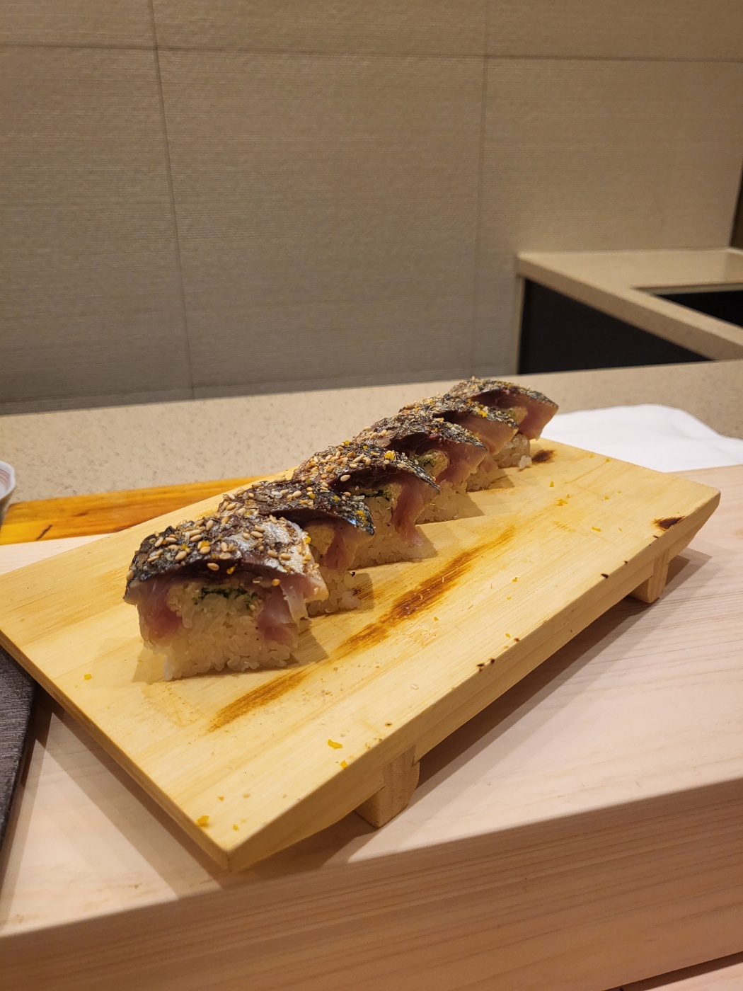 살짝 굽고 위에 깨소금을 뿌려준 고등어 초밥